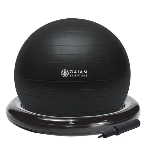 The Gaiam Balance Ball & Base Kit works great behind a desk in the office as well as at home as a yoga or stability workout ball. Stays in place and will not roll away with the base kit; Ball and base are not connected and can be removed for ball-only workouts; Anti-burst - safe for users up to 300 pounds; Includes an air pump