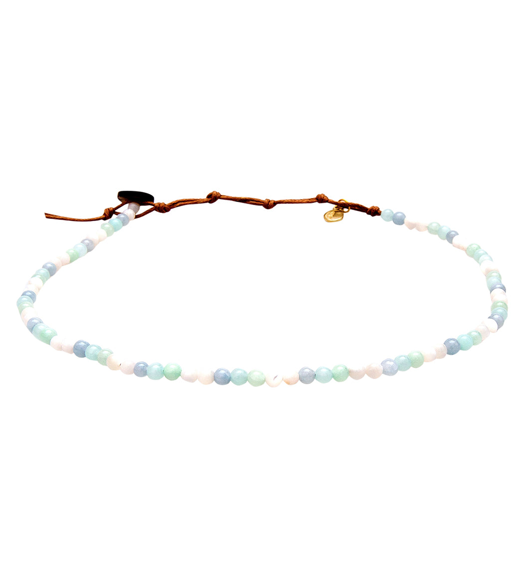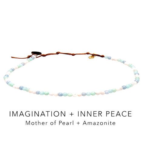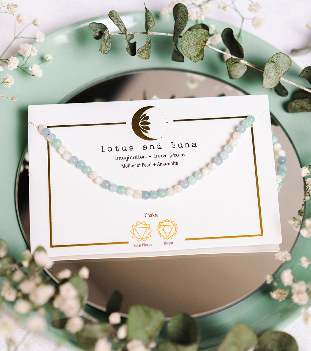 Amazonite soothes the spirit and calms the soul. It promotes clarity and self-love. Radiating the soothing energy of the ocean Mother of Pearl stimulates imagination and intuition.