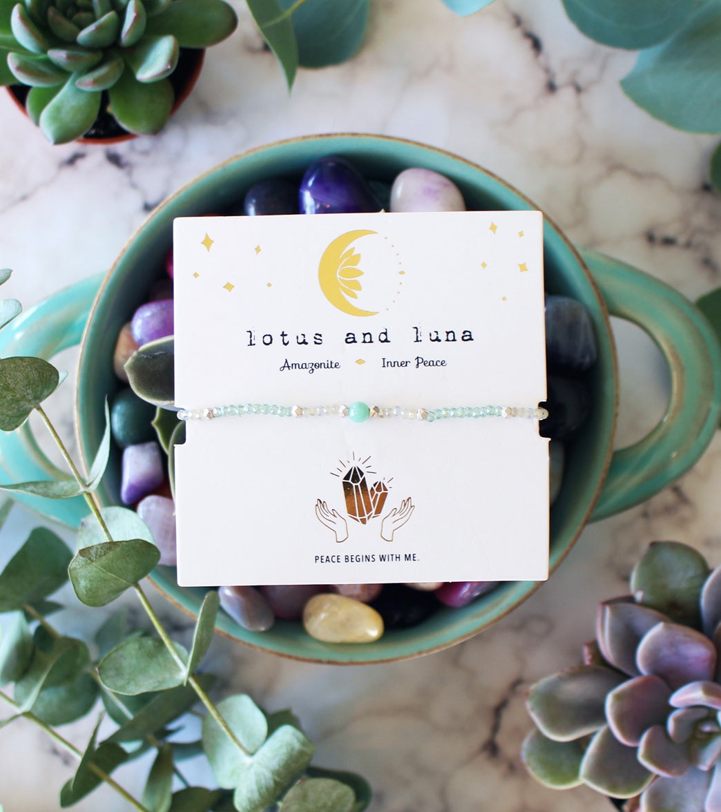 Featuring various healing stones, and delicate crystal beads, the Lotus and Luna Peace Amazonite Goddess Bracelet brings together style and purpose. Experience the power of manifestation by repeating these words often: "Peace begins with me." The Goddess Collection was created to wear as a talisman of positive affirmations to guide you confidently toward your inner goddess. Soothing for the spirit and calming to the soul, Amazonite is known to promote clarity and self-love.