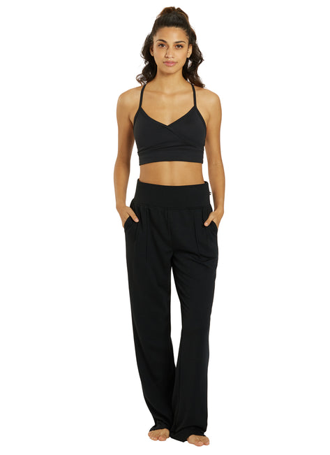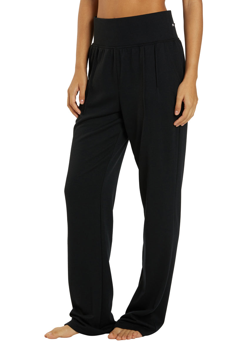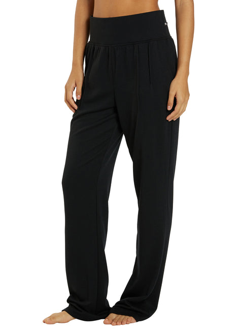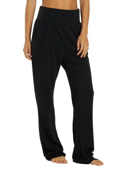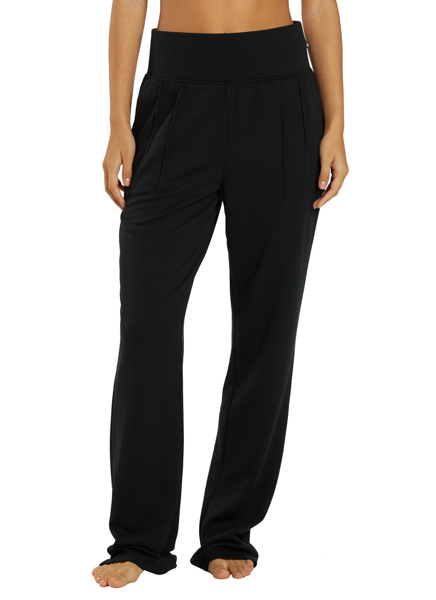 - Wide flat-front 3 1/2" waistband with encased elastic and pintuck pleats