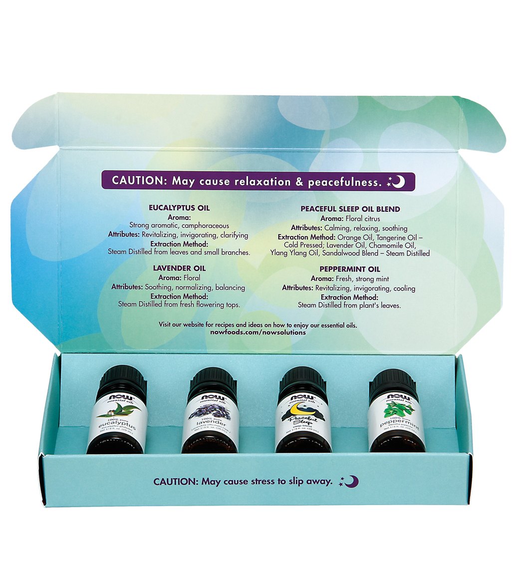 • Includes lavender, peppermint, eucalyptus, and Peaceful Sleep blend essential oils.