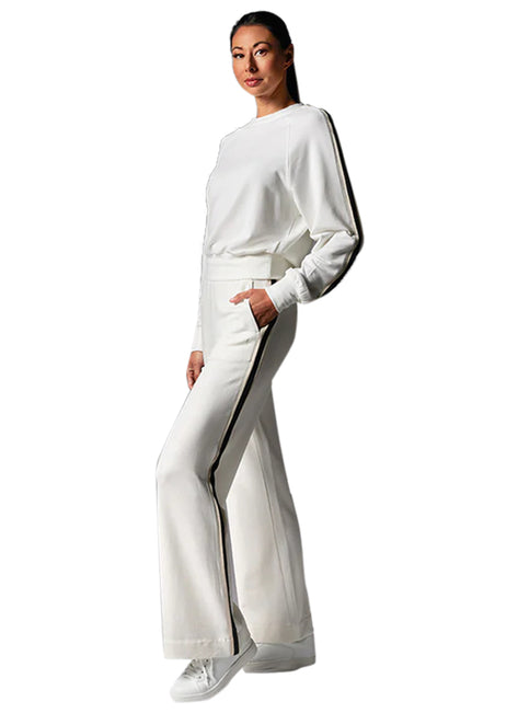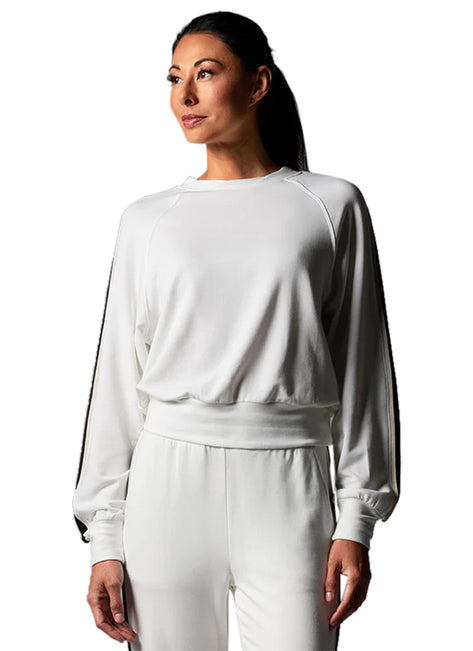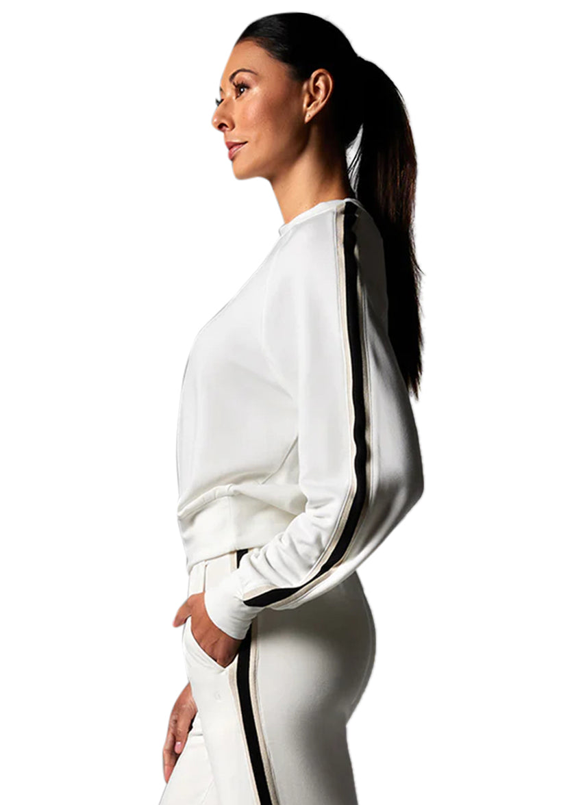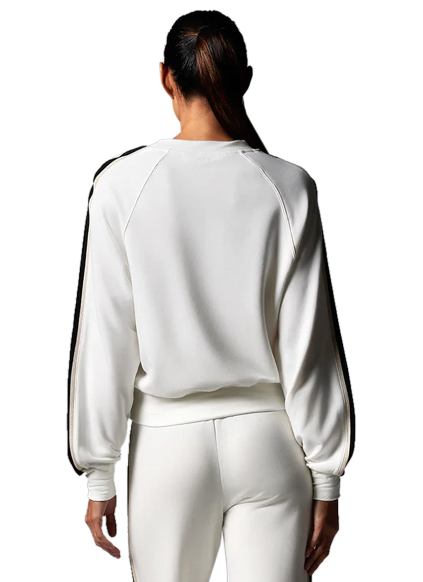 Crew neck sweatshirt with rib collar, cuff and hem, hits slightly below waist.