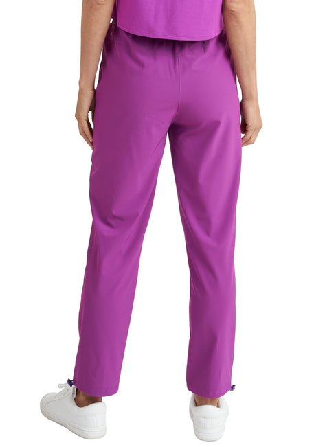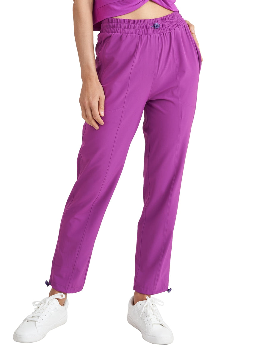 The Thrive Societe Bungee Hiking Jogger is a stretch woven pull-on pant with an elastic waistband and inner drawcord. Straight leg with adjustable bungee cord at hem. Side pockets and back zipper pocket to keep essentials handy. Perfect for pre or post-studio.