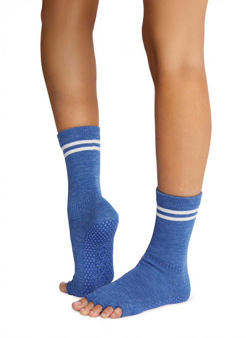 Enhance your performance with the Toesox Crew Half Toe Grip Socks. Its five-toe design allows your toes to spread naturally for a better-supported stance, while a patented non-slip sole provides secure footing as you move on and off the mat.