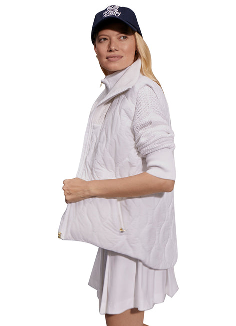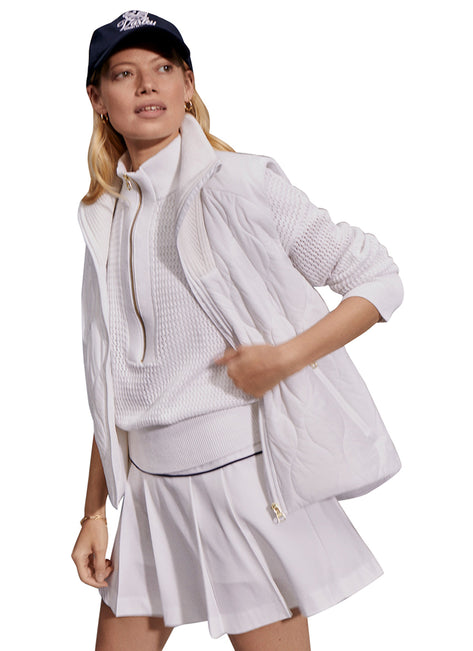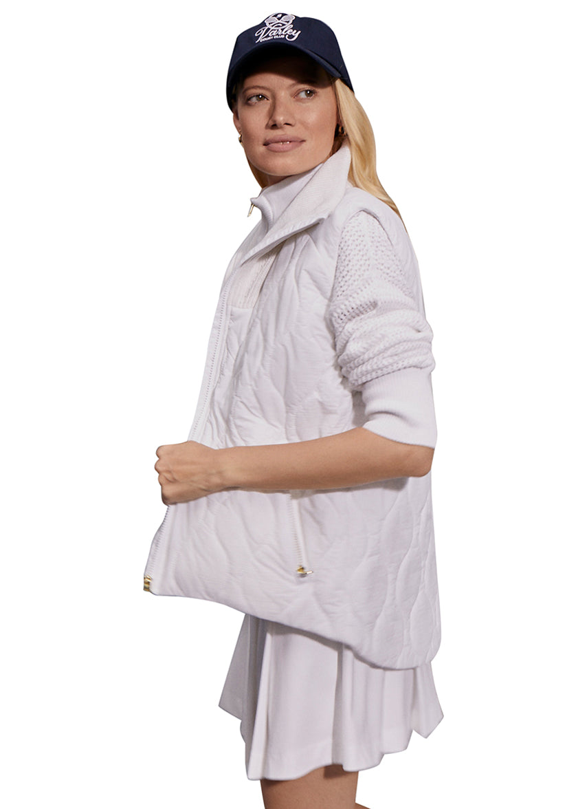 This relaxed-fit gilet offers easy layering with a soft quilted design and an oversized, ribbed collar. Its angled zip pockets and deep back yoke add practicality and a chic edge – perfectly paired with a head-to-toe tennis look when off court.