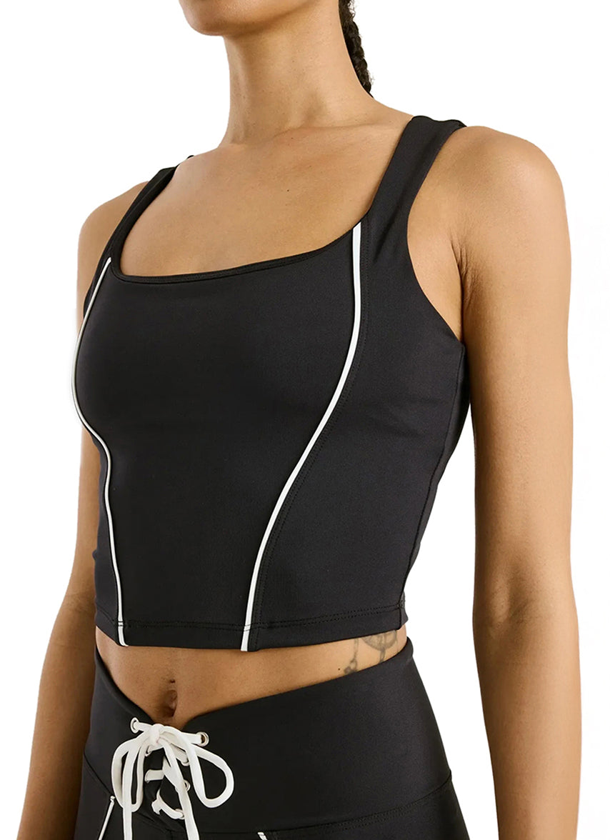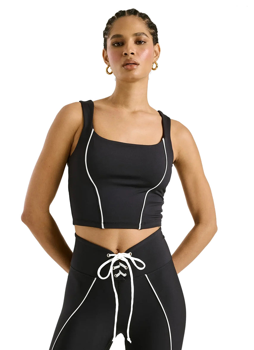 A sporty take on the fitted and ultra-fem corset. The Corset Tank doubles as a bra and top.
