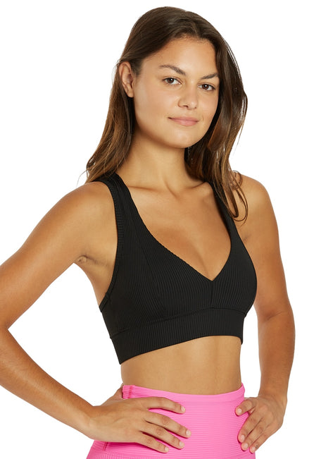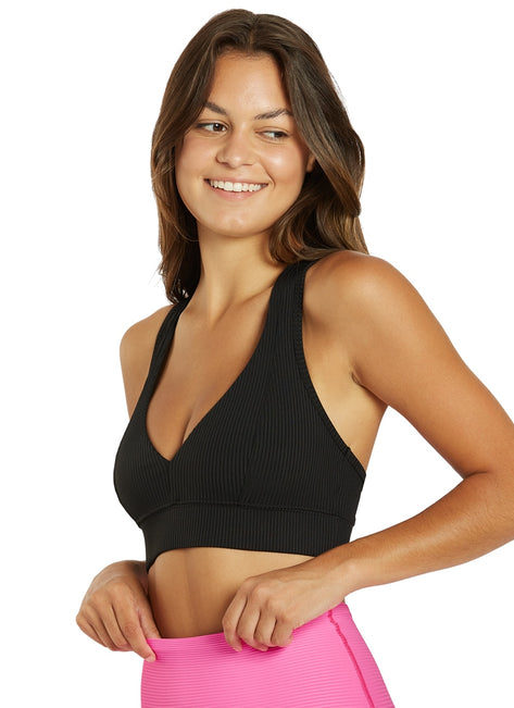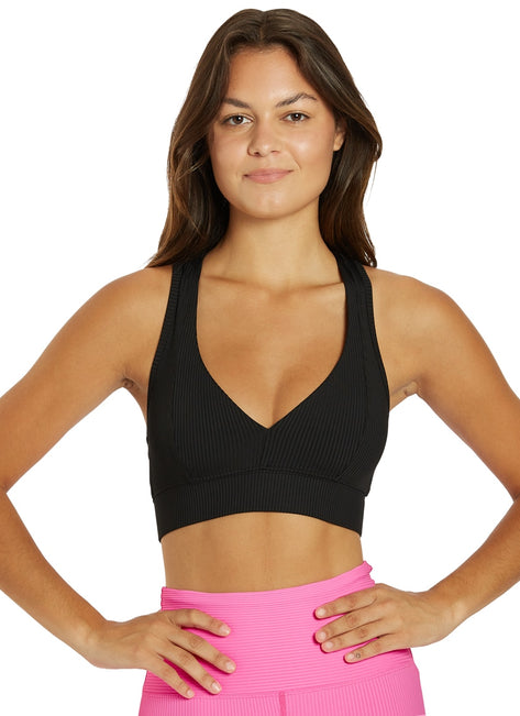 A flirty plunging deep-V with a sporty racer back for the best of both worlds. The Year of Ours Tess Ribbed V Bra has a princess seam detail along the front with 2" elastic band. Made with Spandex Active Rib.